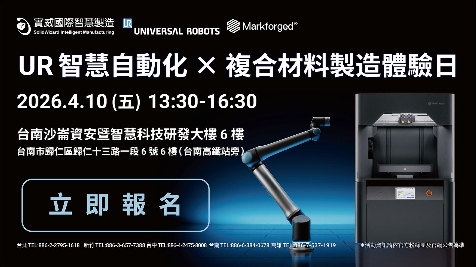 本次活動以「UR 協作機器人智慧自動化整合」為核心,結合實際市場需求最高的三大應用,智慧堆棧、焊接自動化、AI視覺辨識與定位。透過Universal Robots原廠趨勢分享加上SI實務經驗,並結合實機整合展示,完整呈現UR協作機器人從單機到生產線的應用價值。 -