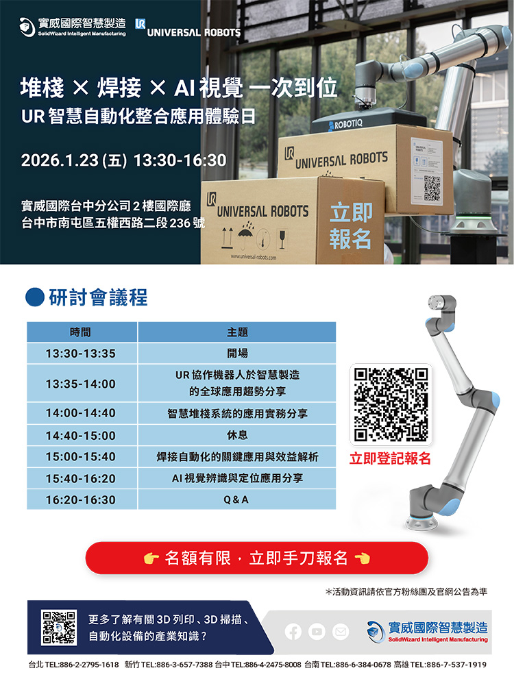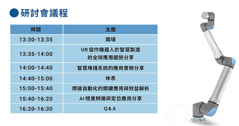 本次活動以「UR 協作機器人智慧自動化整合」為核心,結合實際市場需求最高的三大應用,智慧堆棧、焊接自動化、AI視覺辨識與定位。透過Universal Robots原廠趨勢分享加上SI實務經驗,並結合實機整合展示,完整呈現UR協作機器人從單機到生產線的應用價值。