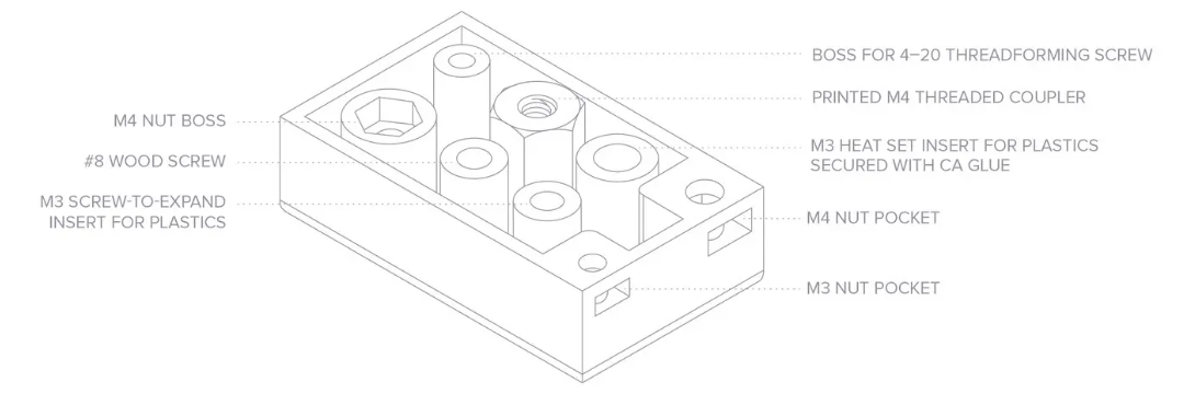 為了速度和簡單性,最好放棄插入件和螺母,而直接擰入 3D 列印零件。無論是自攻螺紋還是使用自攻螺絲,專為塑膠使用而設計的現成硬體都可以很好地與樹脂和熱塑性粉末等 3D 列印材料配合使用。