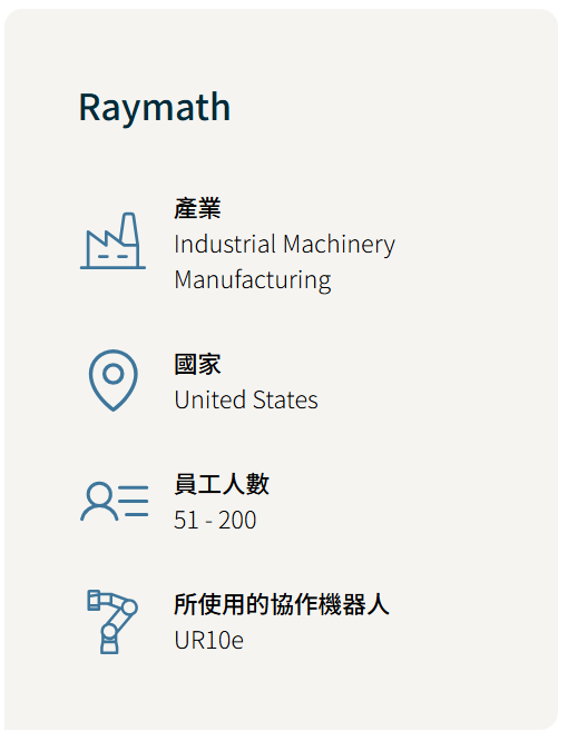 總部位於俄亥俄州的金屬製造商Raymath轉向Universal Robots ,以自動化複雜的TIG焊接,以及MIG焊接和CNC機器撫養應用。該公司的新cobot應用程序顯著擴大了生產,並幫助Raymath滿足客戶需求,在不到12個月的時間內實現了投資報酬率。