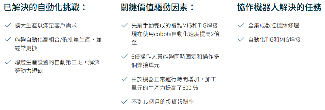Cobots使用一半的操作人員處理難以配備的流程,並以兩倍的速度焊接,從而提高4倍的生產力。