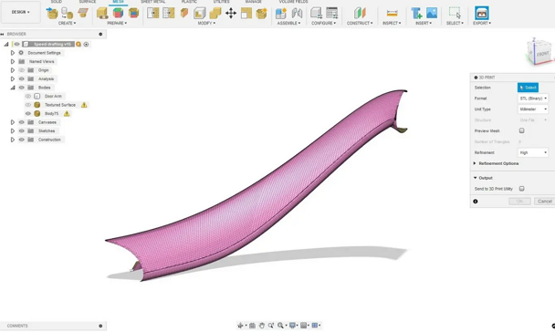 3.2要直接列印零件,請右鍵點選頂層組件並選擇「另存為網格」。這會將剩餘的 CAD 幾何體與紋理網格表面一起轉換為網格。此操作將建立非流形網格,因為紋理表面尚未縫合到原始零件。大多數切片器(例如 PreForm)可以輕鬆解決和修復這些錯誤,但如果需要,也可以在 Fusion 中或使用網格修復工具直接解決這些錯誤。
